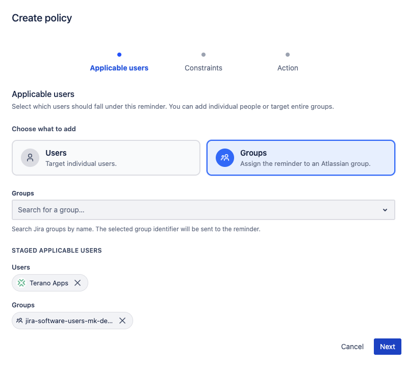 Select which users should fall under this reminder. You can add individual people or target entire groups.