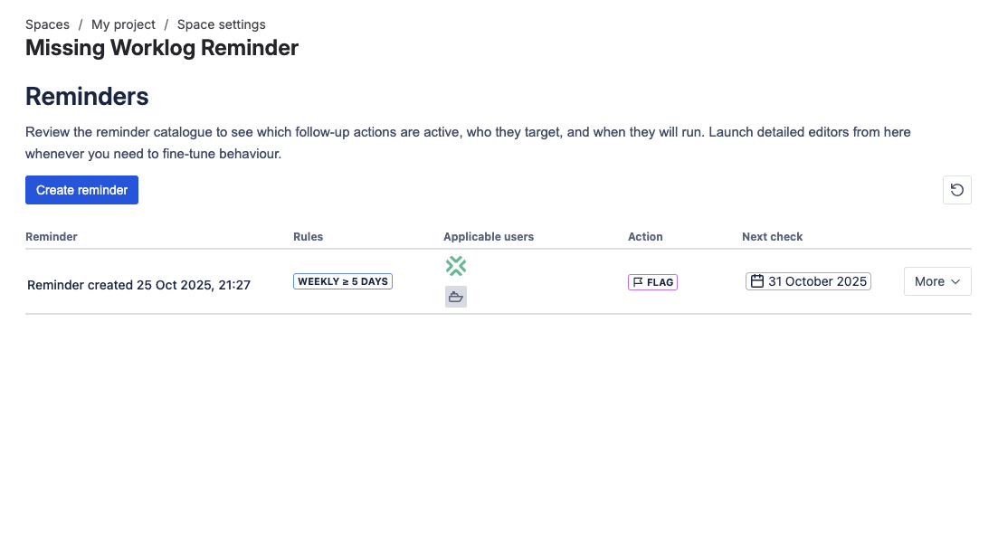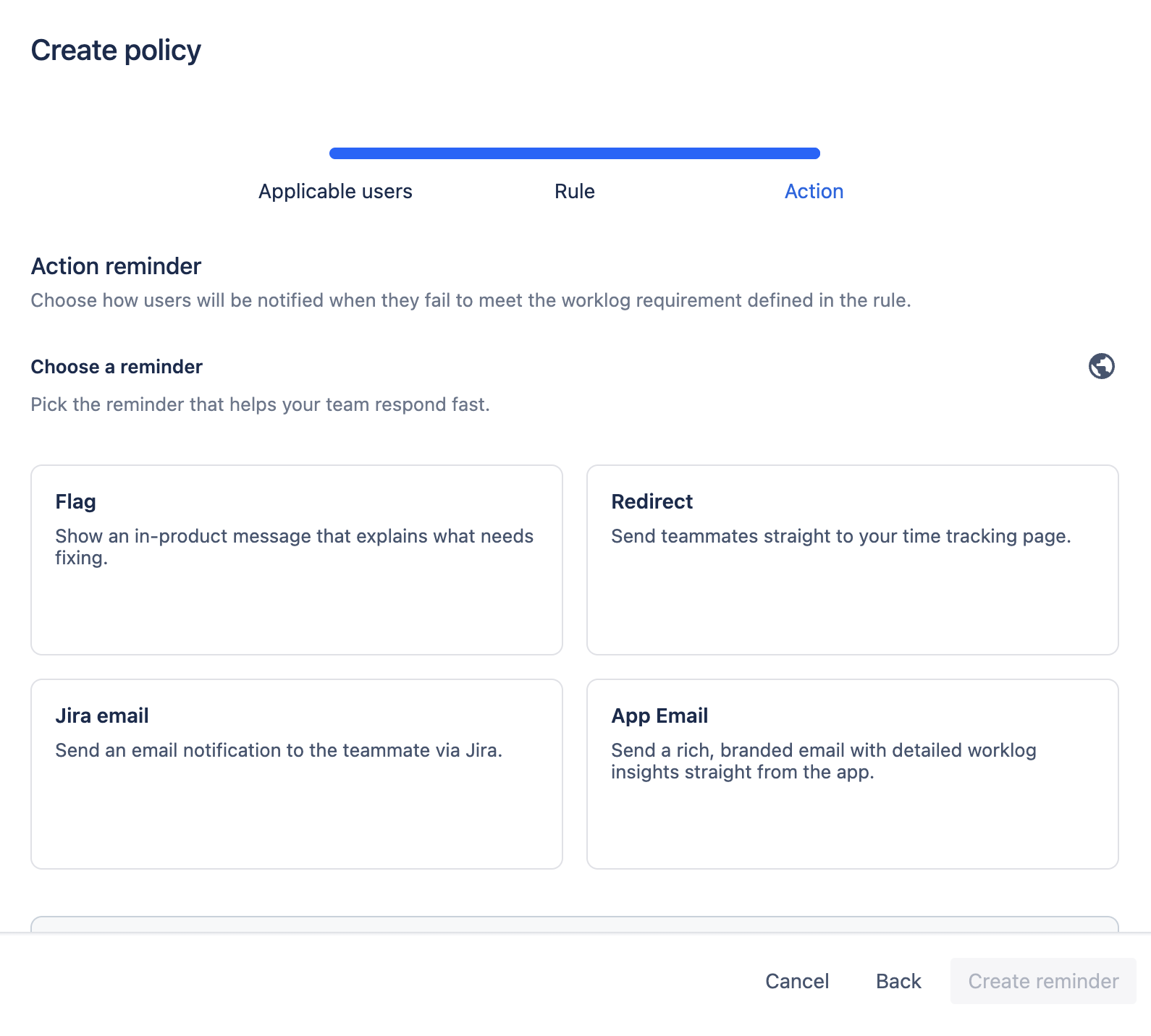 When users fall below the defined threshold, the chosen reminder action will trigger and guide them to correct their worklogs β no manual follow-up needed.