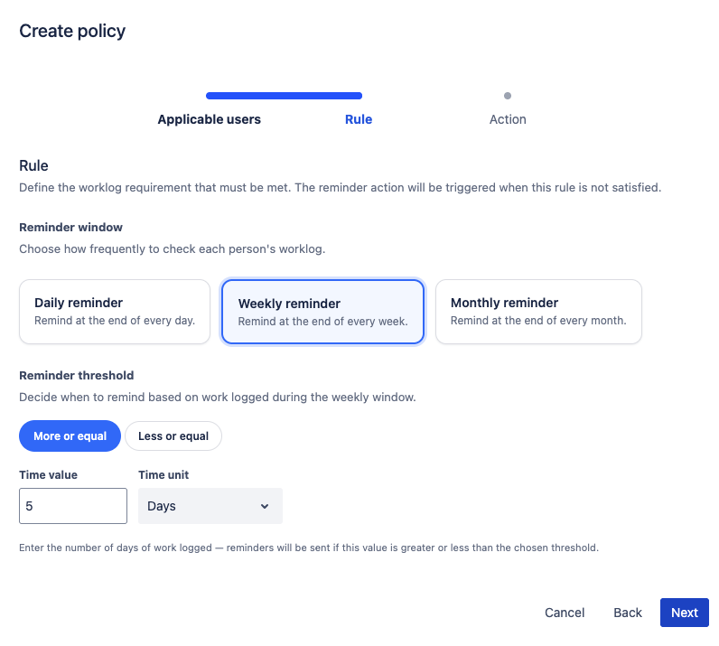 Follow these simple steps to configure who should receive reminders, how often they should run, and what kind of action will be triggered when someone falls behind on their worklogs.